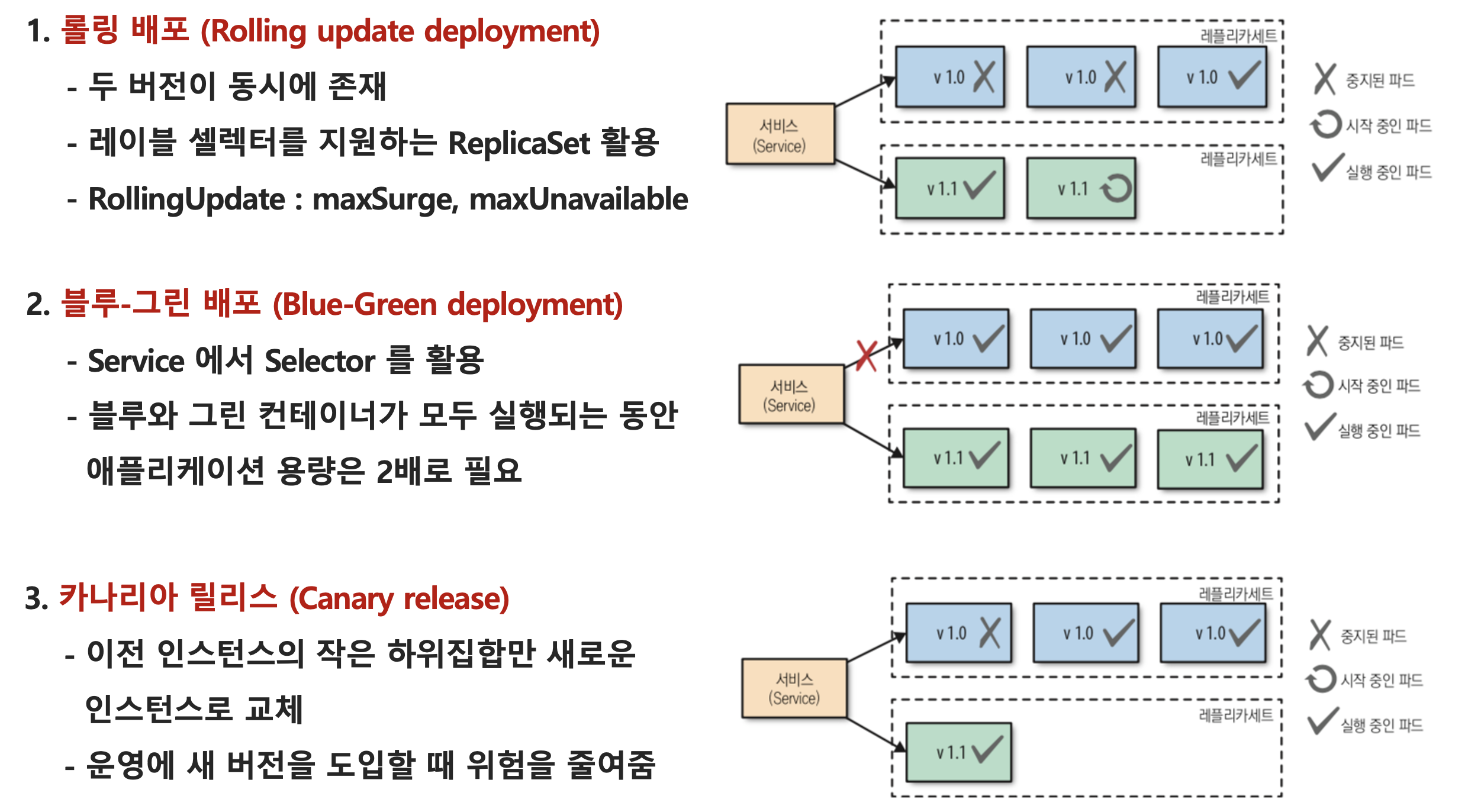 - 지원 배포 전략: Rolling update, Blue-Green, Canary