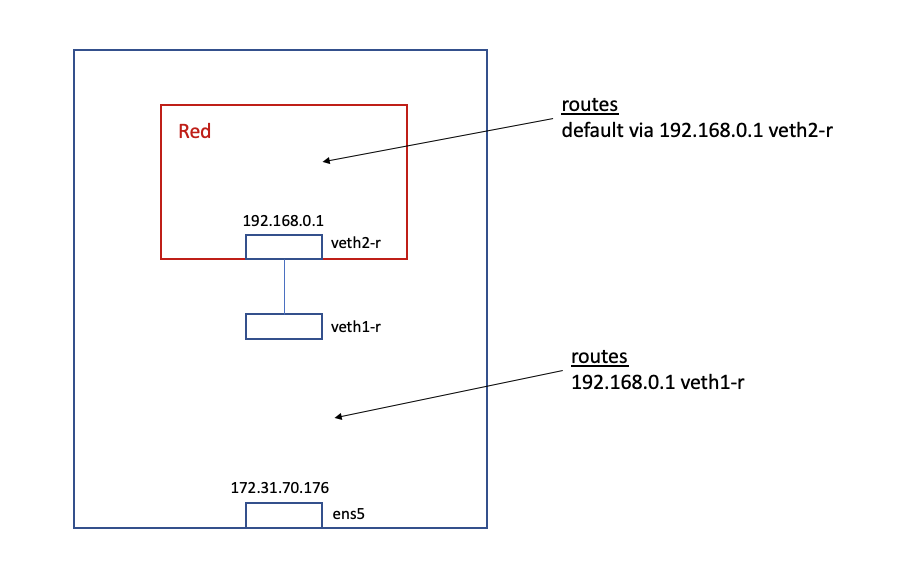 $ sudo ip netns exec red ip route add default via 192.168.0.1 dev veth2-r