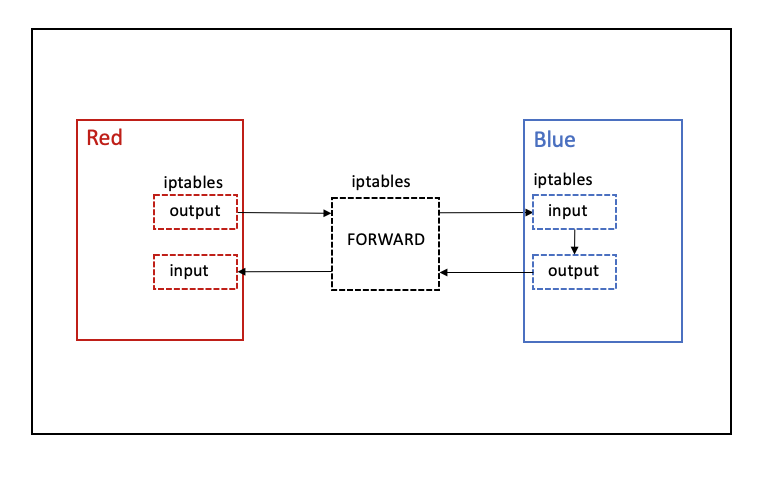 즉, red 네임스페이스의 iptables, 노드 네임스페이스의 iptables, blue 네임스페이스의 iptables 를 모두 지난다. 그러므로 각 iptables 의 filter 체인을 모두 확인해야 한다.