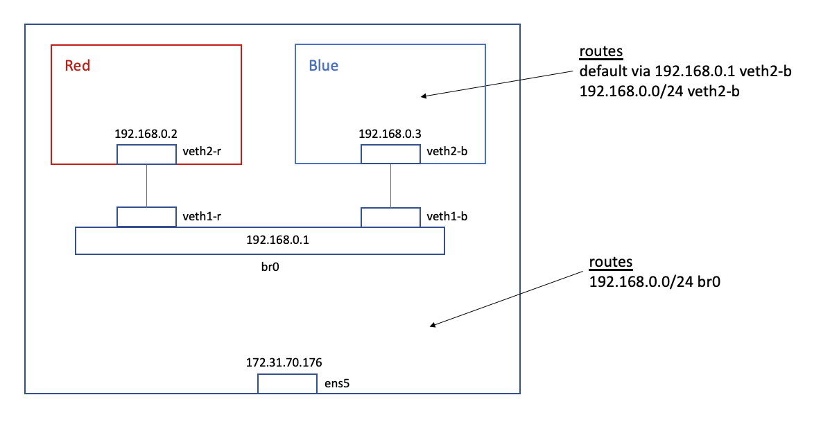 $ sudo ip netns exec blue ip route add default via 192.168.0.1 dev veth2-b
