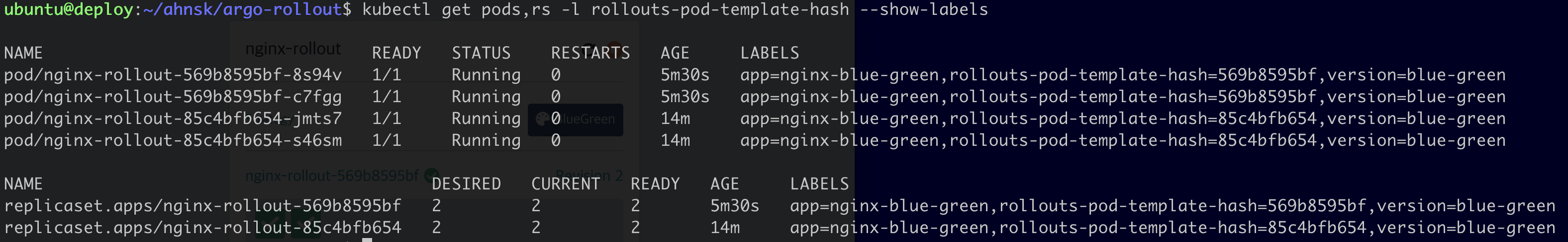 replicaset.apps/nginx-rollout-85c4bfb654 0 0 0 19m app=nginx-blue-green,rollouts-pod-template-hash=85c4bfb654,version=blue-green