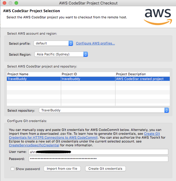 AWS Access Key ID, Secret Access Key 를 넣고 region 을 선택합니다. 그리고 CodeCommit 의 git id 와 패스워드를 입력하면 소스를 다운받을 수 있습니다.