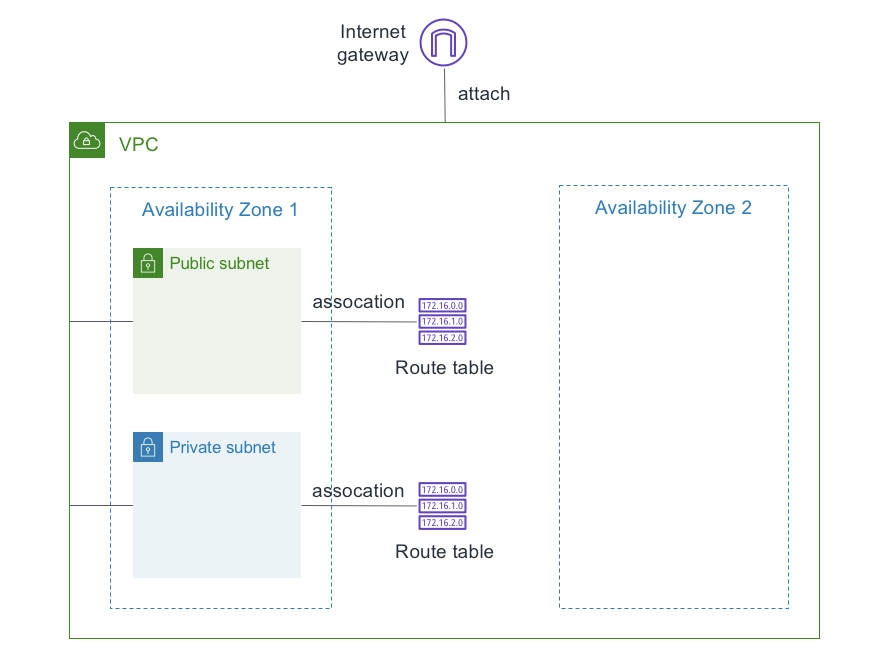 그리고 외부와의 통신을 위해서는 Internet gateway (IGW)를 생성합니다. 이것은 software gateway 라고 생각이 들고 여기까지는 VPC 와 상관이 없습니다. 그래서 이해하기 쉽게 IGW 를 VPC 바깥에 그렸습니다.