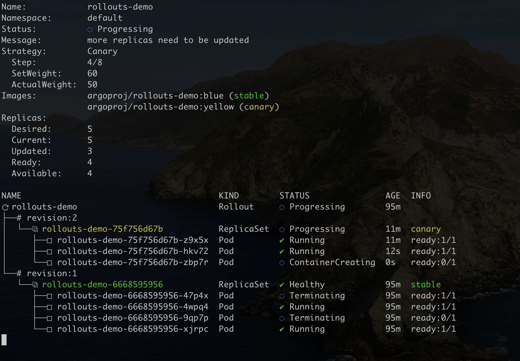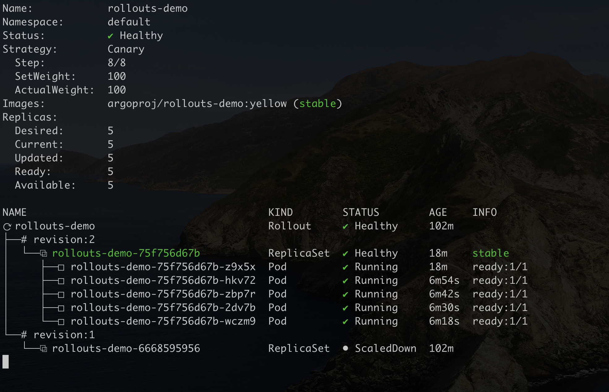Rollout 은 strategy 만 제외하면 ReplicaSet 혹은 Deployment 와 동일하다. 그래서 Rollout 을 배포하면 ReplicaSet 과 Pod 는 Kubernetes Core Resource 타입으로 동일하게 생성되고 조회할 수 있다.