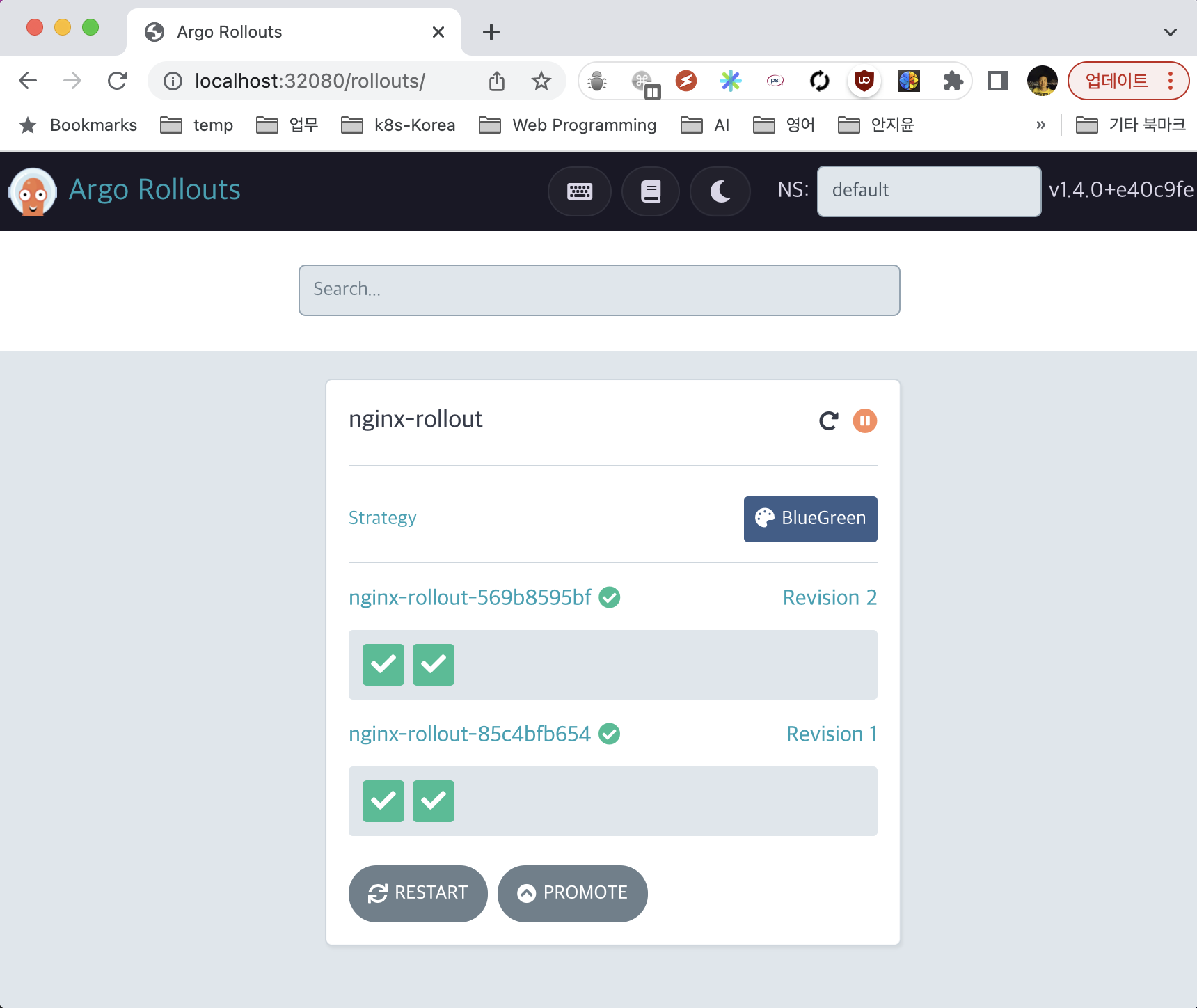 완전히 Green 으로 변경하려면 Rollout 을 promote 하여 최종 적용을 하던지 abort 하여 중단, 혹은 undo 하여 Pause 보다 이전 단계이 최초 Blue app 배포 단계로 돌아가는 방법이 있다.