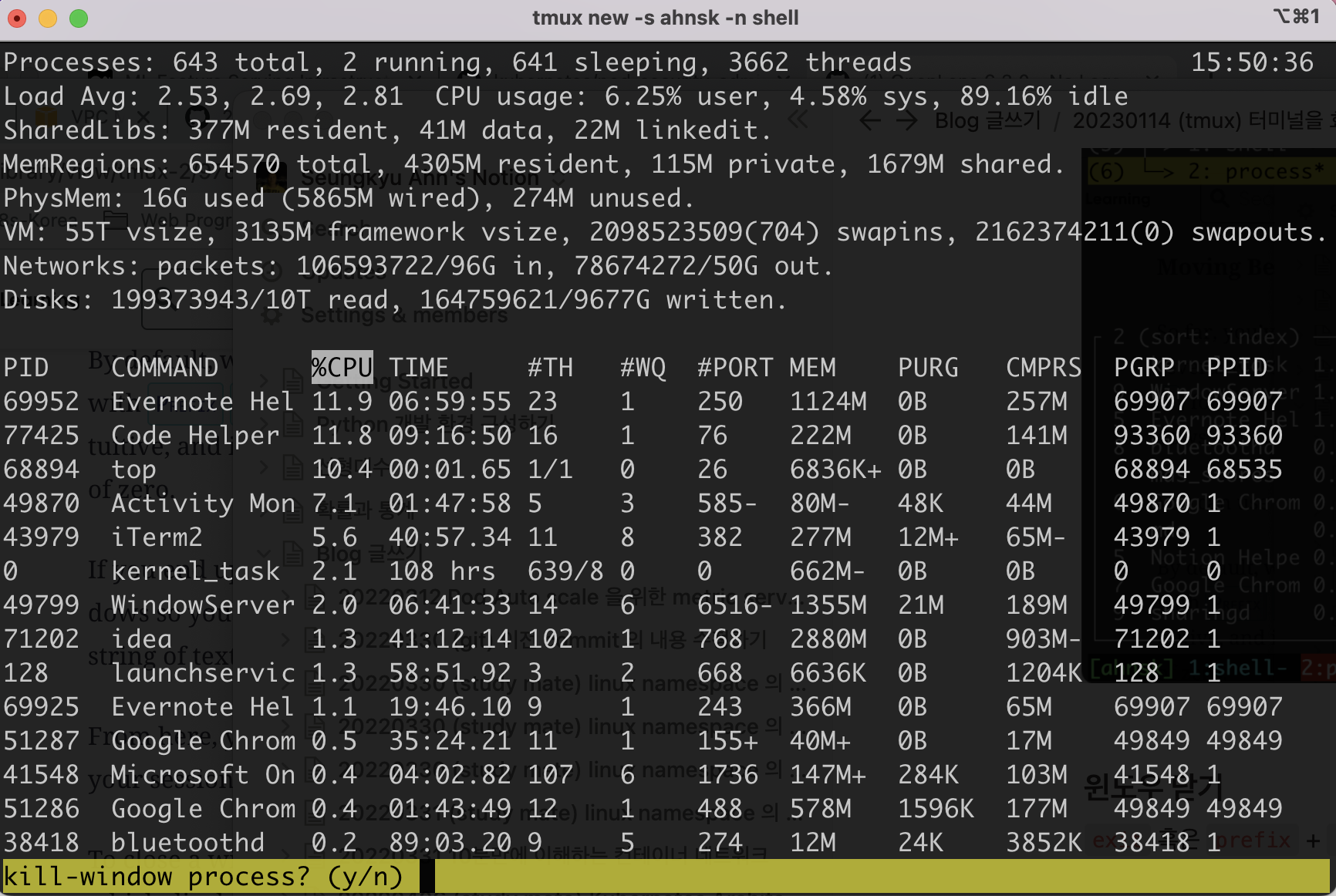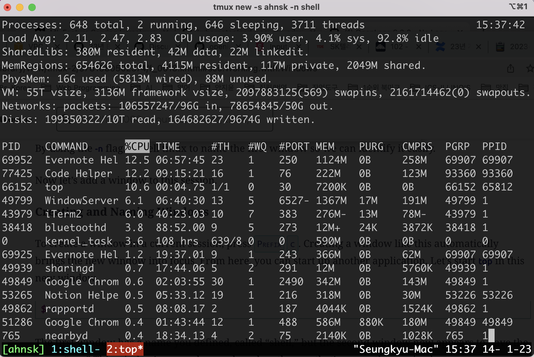 prefix + c 명령으로 새로운 윈도우를 만들 수 있다. 이렇게 새로 만든 윈도우에 top 명령을 실행해 보자.