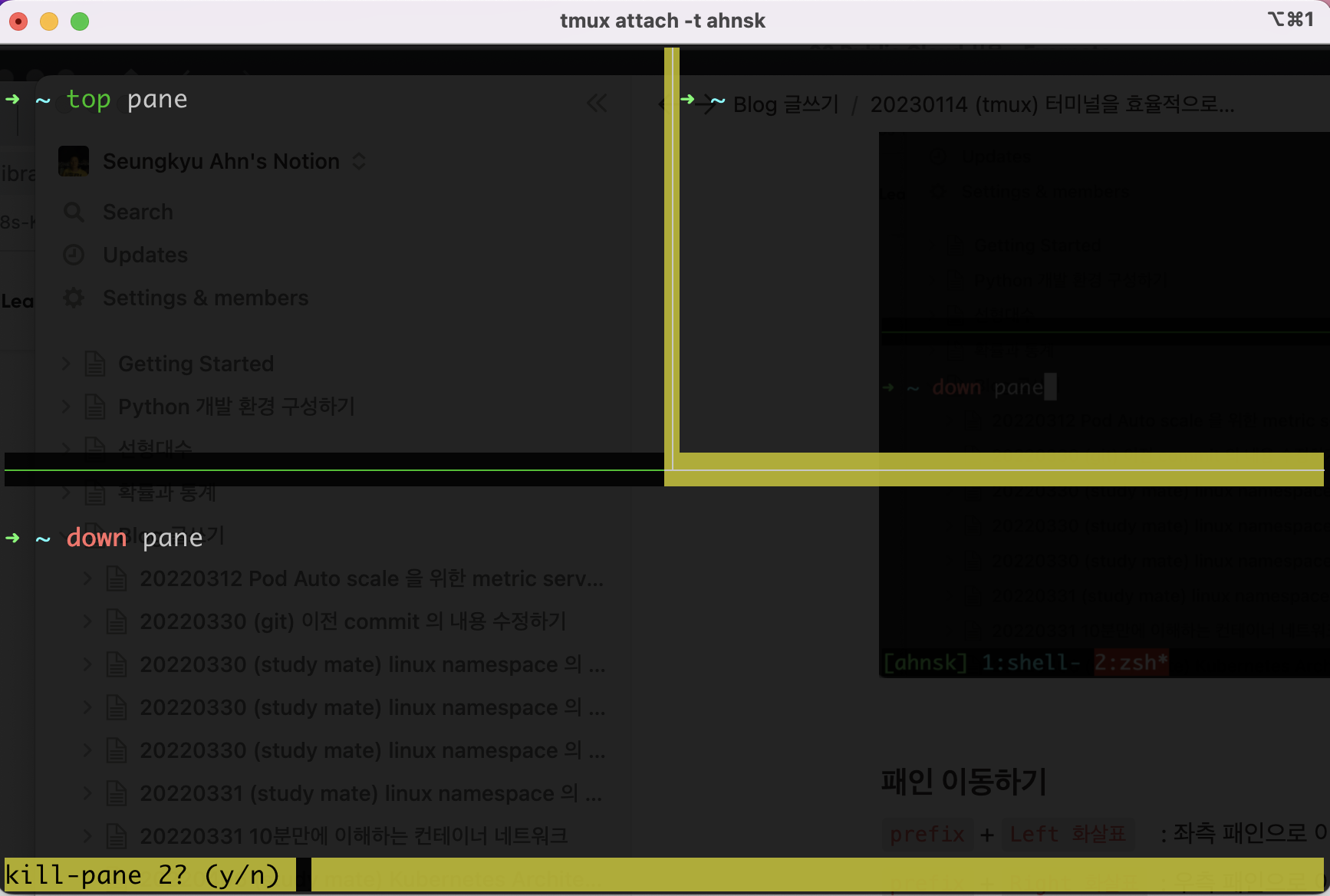 prefix + x 명령으로 현재 선택된 패인을 삭제할 수 있다. exit 로도 삭제가 가능하다. 가끔 화면에 키보드 입력이 안돼서 exit 를 화면에 입력할 수 없는 경우가 있다. 이 경우에는 명령모드인 prefix + x 로 삭제해야 하므로 명령모드도 알아 두는 것이 좋다.