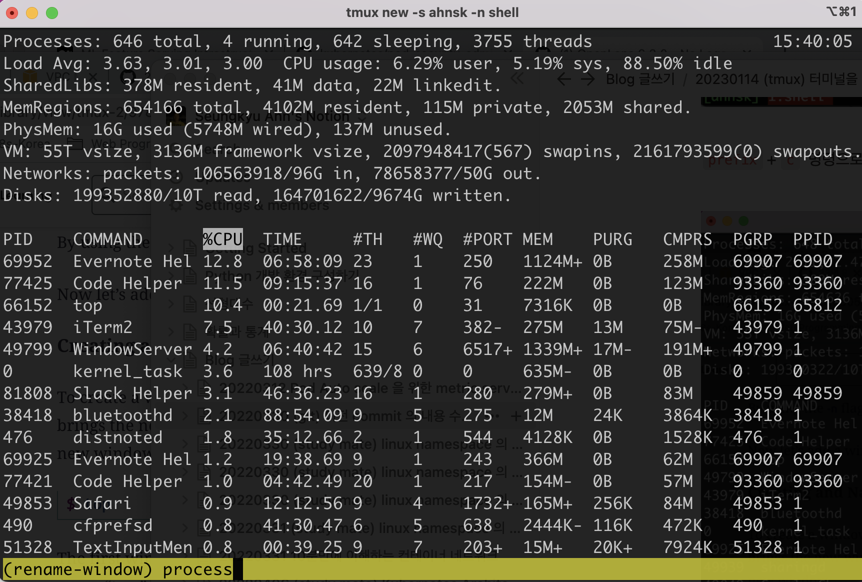 첫번째 윈도우의 이름은 shell 이고 두번째 top 이 실행되고 있는 윈도우의 이름은 top 이다. (top 이 실행되고 있으므로) 두번째 윈도우 이름을 process 로 변경해 보자.