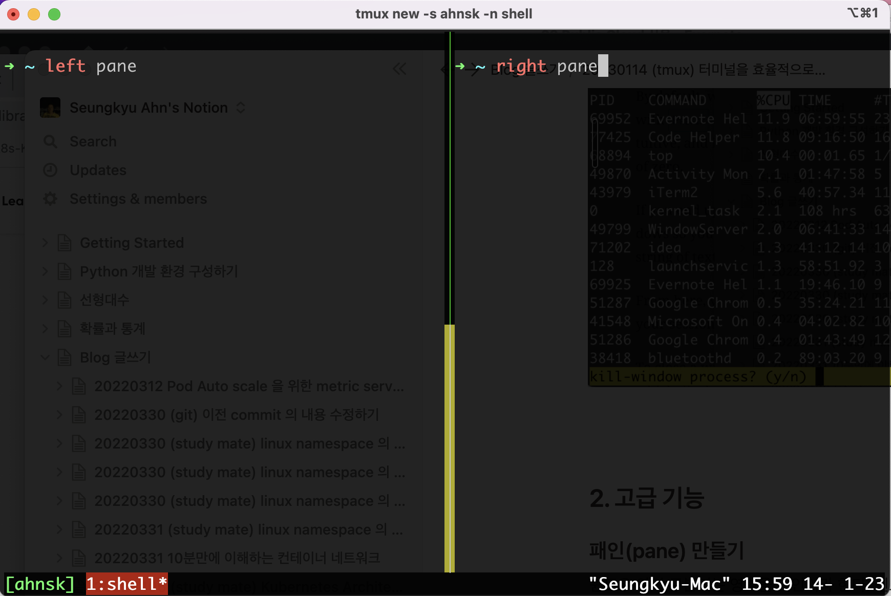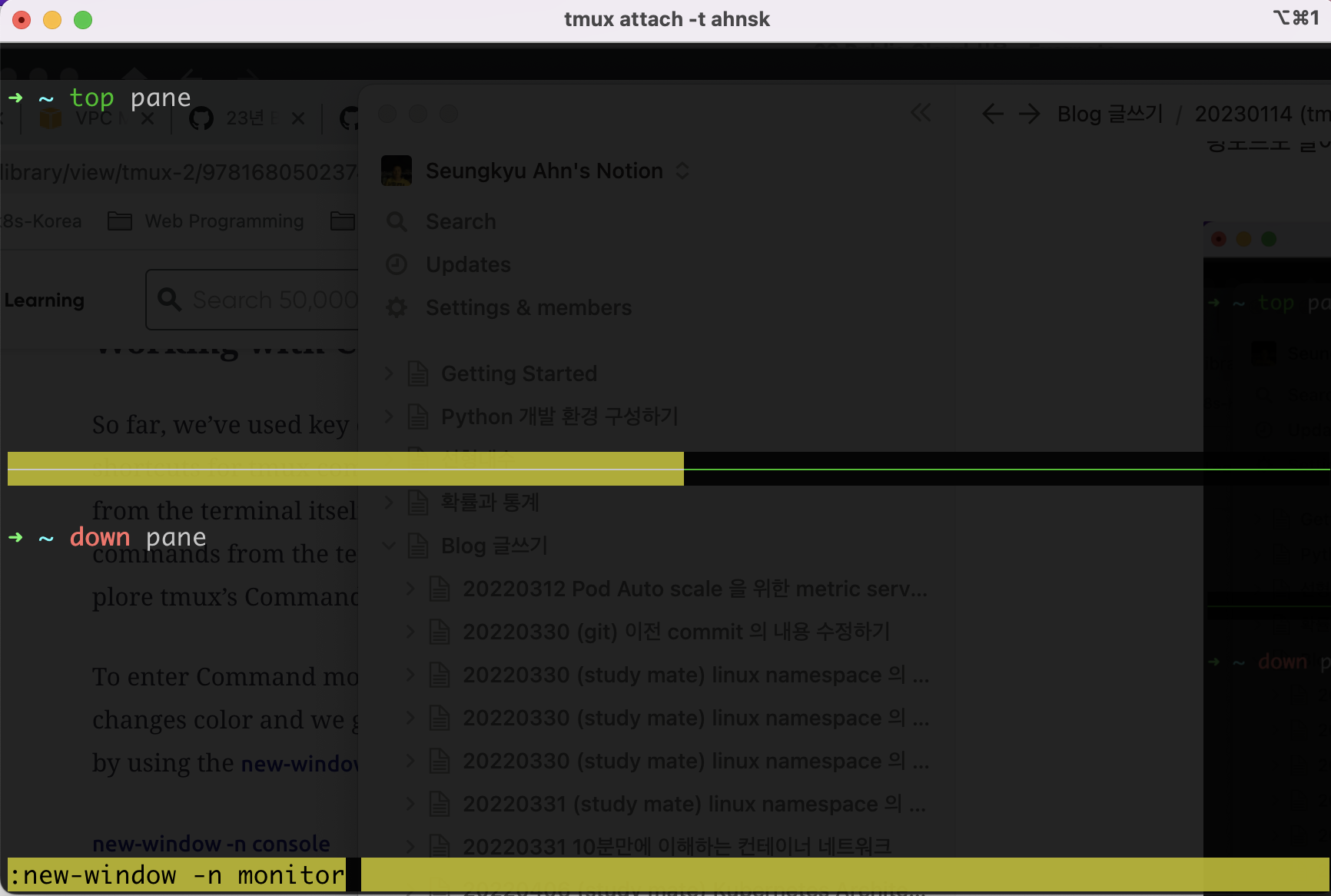 위와 같은 기능을 제공하는 툴에는 tmux 라는 sw가 있다. 일반적으로 linux 에는 기본으로 설치되어 있고 mac 에서는 쉽게 설치할 수 있으므로 쉽게 활용할 수 가 있다.